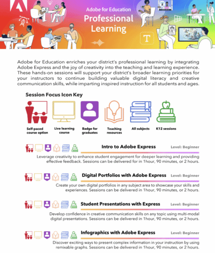 Check out our catalog that highlights several of the professional learning topics and workshop available to schools and individual educators! Many more workshops options are available, including all Creative Cloud apps and resources for CTE courses. Contact us to learn more!
