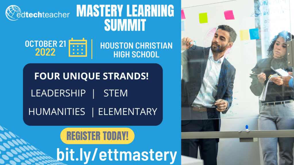 You may also want to attend the Mastery Learning Summit on October 21, 2022 at Houston Christian High School. I will be keynoting this EdTechTeacher event along with other experts in the mastery learning movement, offering strands specific for STEM teachers, humanities teachers, elementary teachers, administrators & coaches. Join us on October 21st at Houston Christian High School for this amazing opportunity! Learn more and register here! https://edtechteacher.org/ett_events/mastery2022/