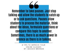 Remember to take pauses. Just stop talking and allow the students to catch up or to ask questions. Pauses allow students to process the material, think about the ideas, formulate questions or compare this topic to another. Sometimes, there is as much power in silence as there is in talking.