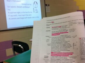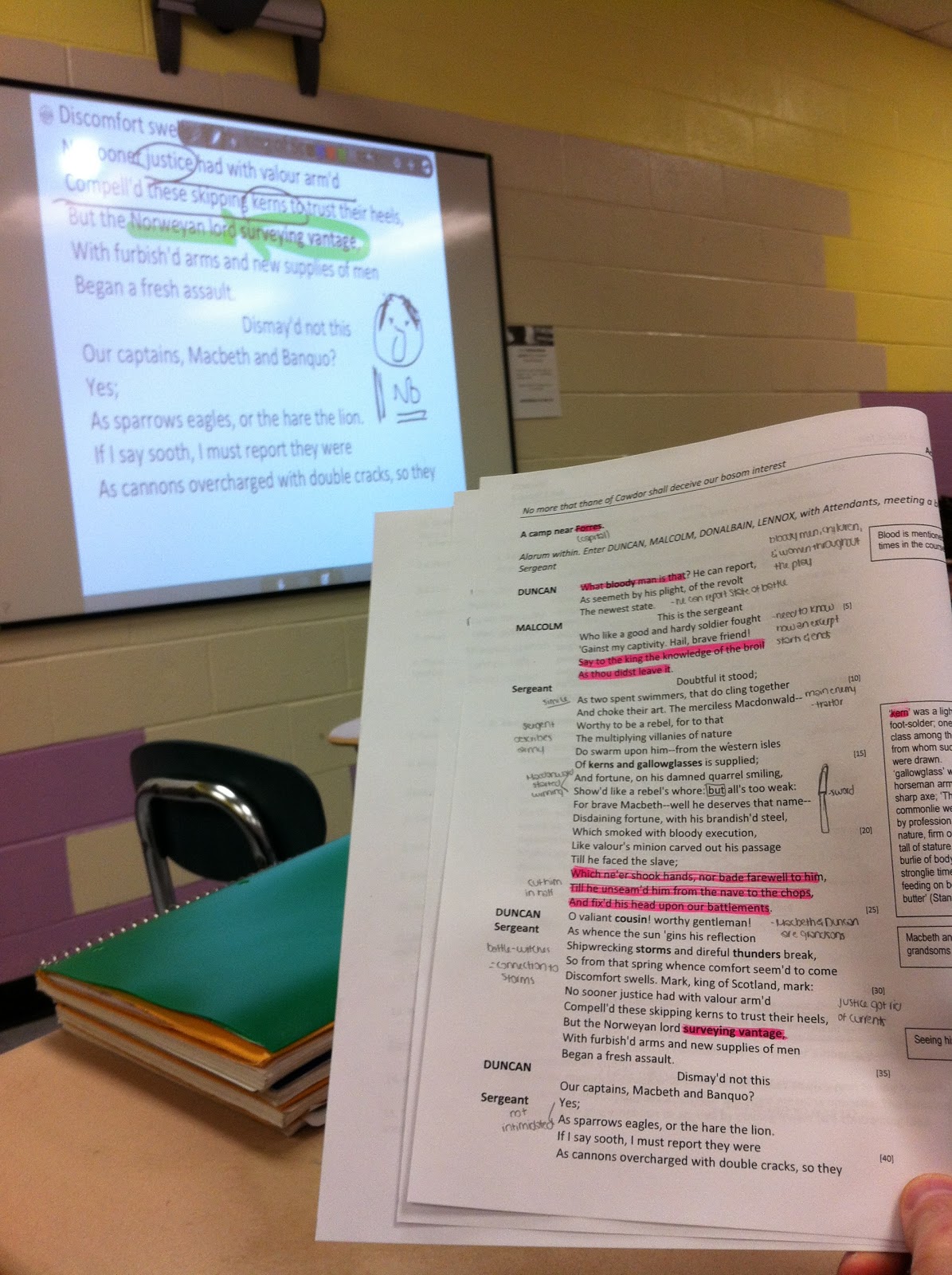 In this English class, the teacher has an iPad though none exist yet for the students. This dynamic exists in many classrooms. At this juncture, the teacher wanted to address note taking as it coincided with the reading of Macbeth. Greg helped her to connect the iPad to a projector and use the GoodNotes app to annotate a PDF copy of the play. Since all of the students had the same PDF version of the text, they could work to annotate their copies in a similar fashion and have the teacher version for future reference.