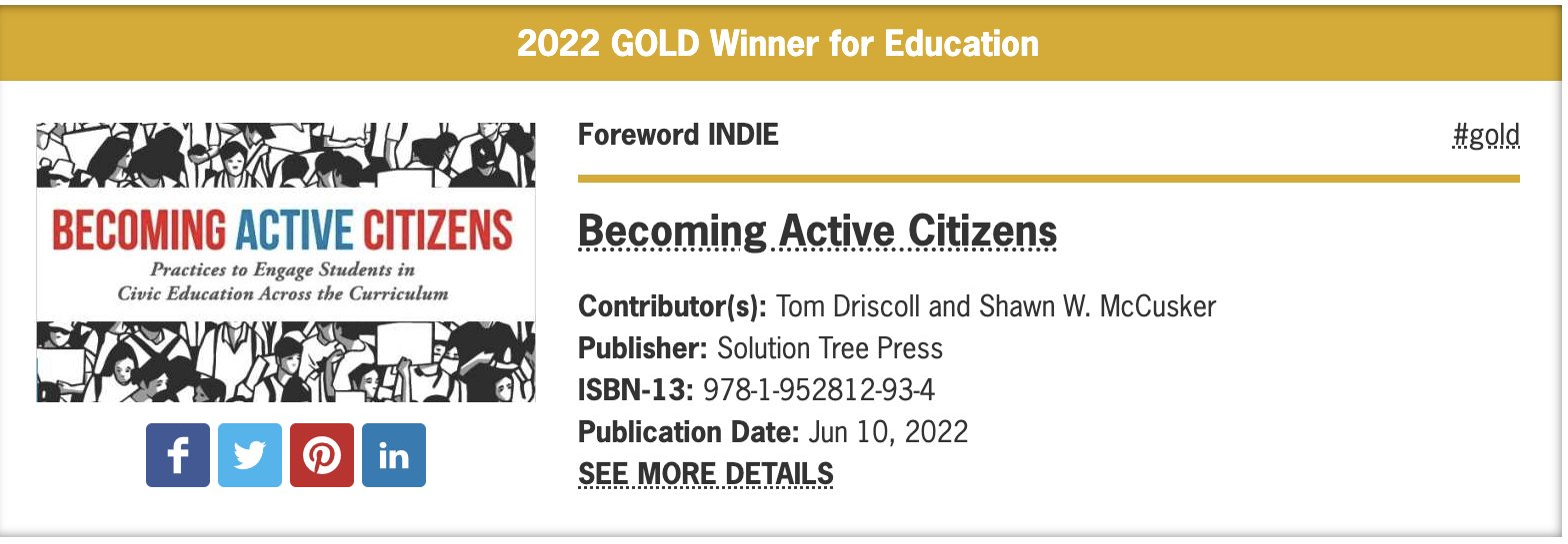 We are thrilled to announce that, "Becoming Active Citizens: Practices to Engage Students in Civic Education Across the Curriculum,” authored by EdTechTeacher's Tom Driscoll and Shawn McCusker, has been honored with the prestigious 2023 Foreword INDIES Gold Award for Education! This recognition is a testament to the dedication and hard work that went into creating a resource aimed at empowering students to become active participants in their communities and societies.